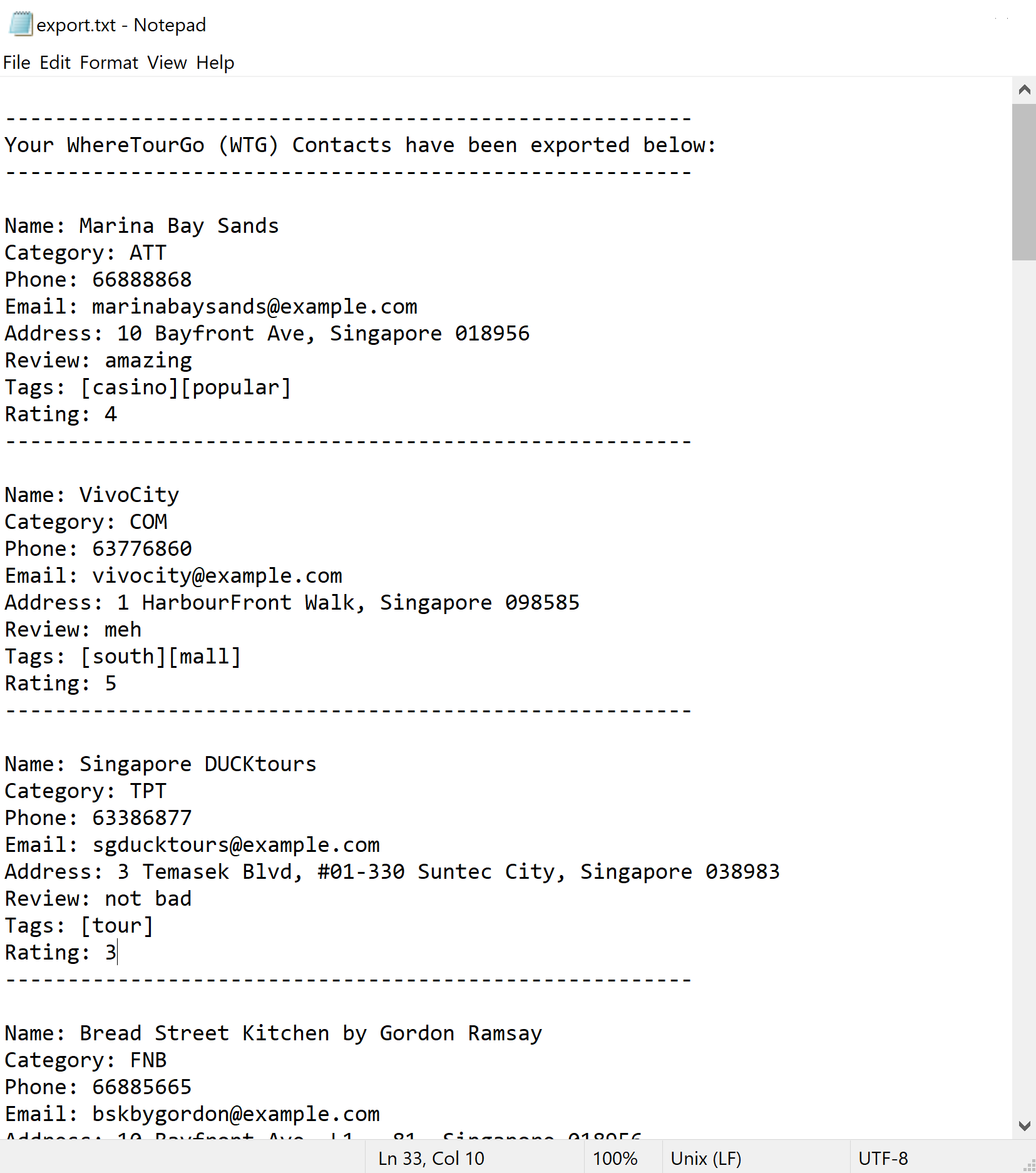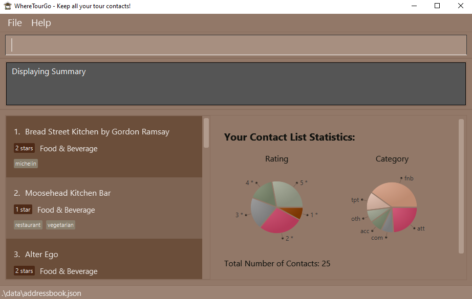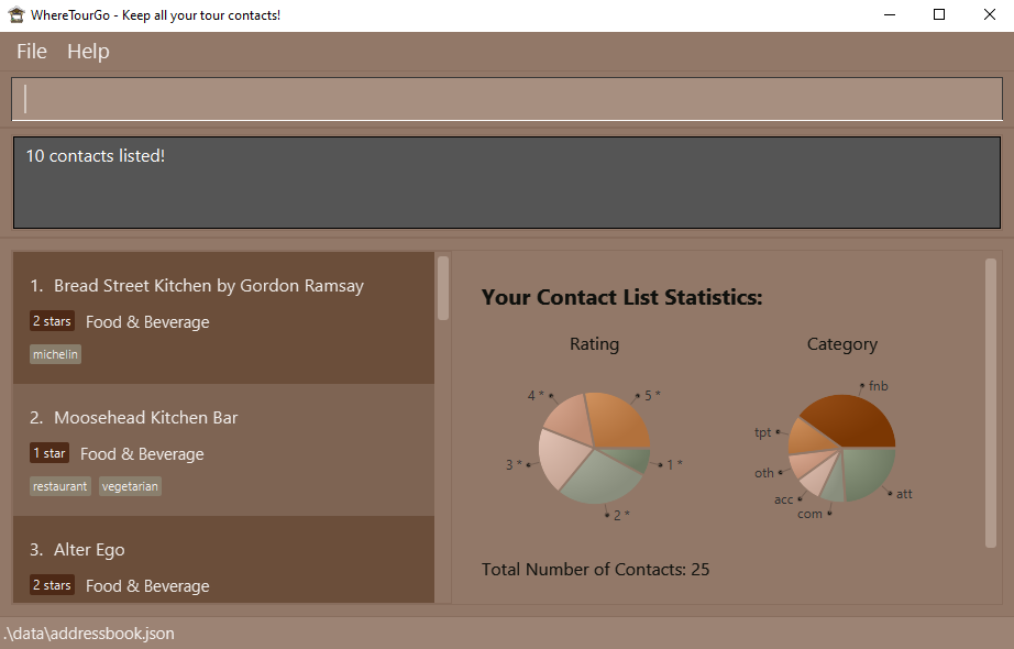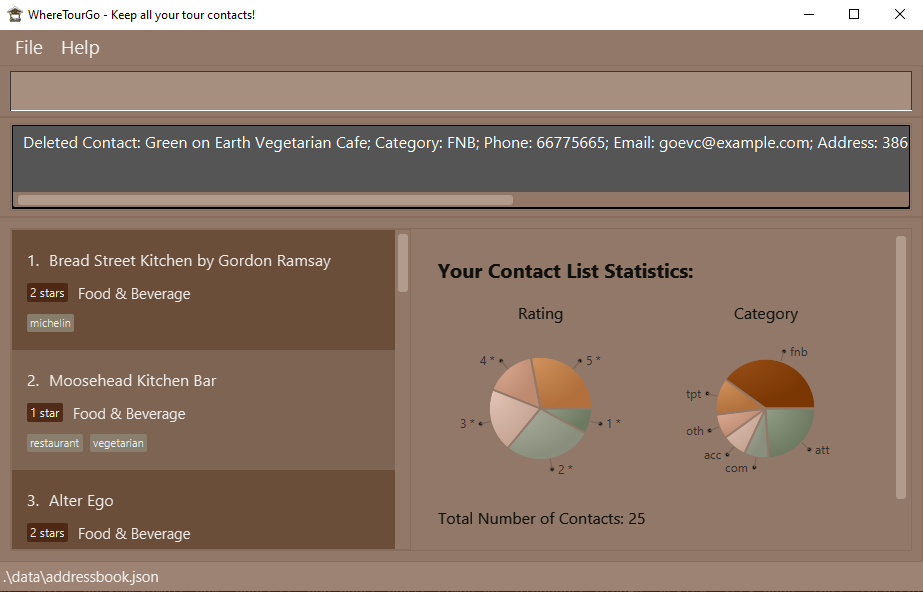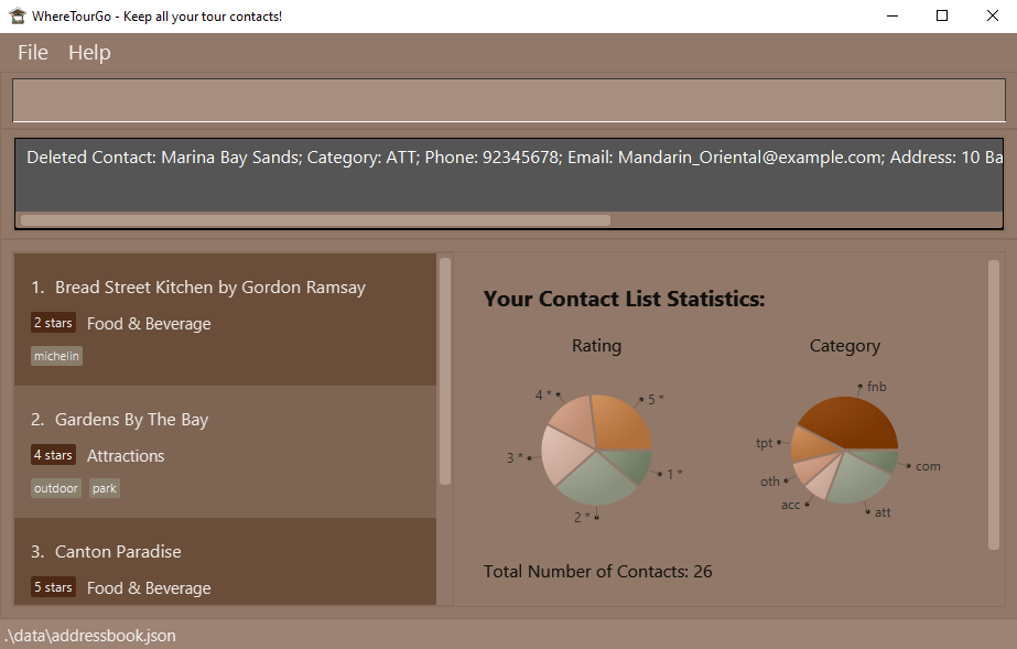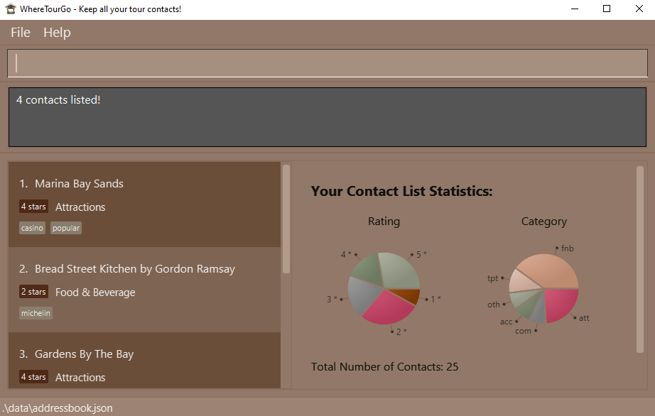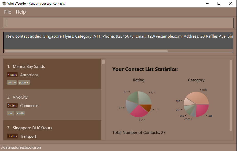 WhereTourGo (WTG) is a desktop app for managing your tour contacts, optimized for use via a Command-Line Interface (CLI) while still having the benefits of a Graphical User Interface (GUI).